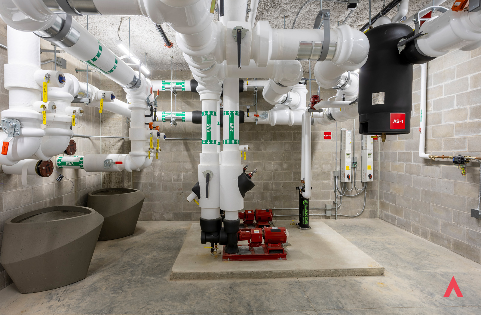 Darcy Solutions deployed a 2-well, 240-ton geothermal system for this 110-unit mixed-use affordable housing development. The aquifer-based heat pump system provides a blueprint for decarbonizing dense urban residential projects.