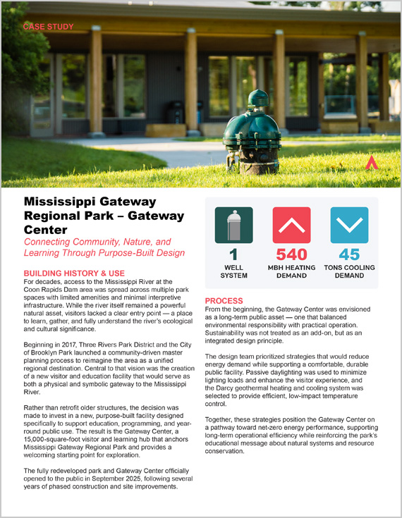 The primary objectives for Mississippi Gateway Park focused on maximizing energy efficiency to abide by the requirement for B3 Guidelines, which any state funding must design around. By embracing cutting-edge HVAC innovation, the project sought to set a new standard for sustainable operations in Brooklyn Park.