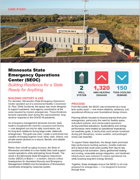 The vision for MN Emergency Ops Center (EOC) was to create a facility that combines high energy efficiency with a low total cost of ownership. The ongoing operations of this facility are critical to solve issues for public infrastructure that happen every day. In a northern climate like Minnesota, the need for systems that are resilient to cold weather and warm alike and keep employees operational is not a “nice to have” it’s a must.