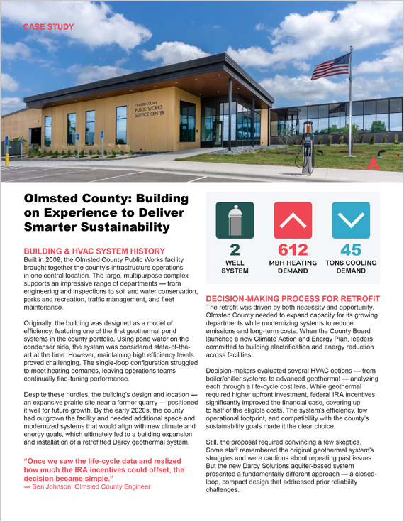 Driven by a desire for innovation and fiscal responsibility, the Olmsted County Public Works is part of a broader county wide approach to sustainable, long lasting public infrastructure. This project targeted a mechanical design that used geothermal to improve energy efficiency to meet state wide standards.